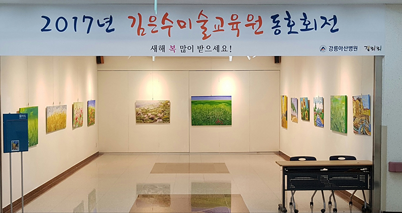 저에게 미술지도를 받으시고 1년뒤에 아산병원 갤러리에서 제1회 개인전도 개최하시고 강릉아산병원 8월호 뉴스매거진에도 실리고, 시청소식지인 강릉플러스에도 소개되는 겹경사를 누렸지요.