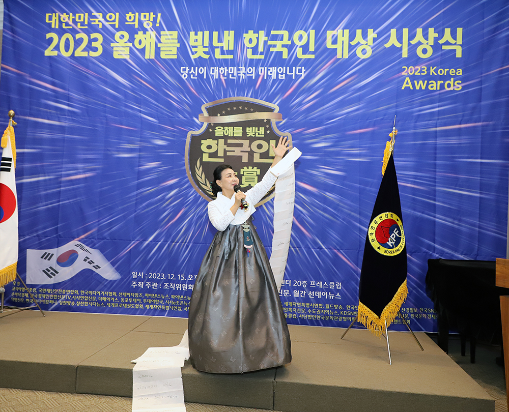[선데이뉴스신문=이종록 기자] 2023제9회 올해를 빛낸 한국인 대상 시상식이 15일 오후 2시 30분 한국언론연합회와 한국미디어기자협회, 선데이뉴스신문. 월간 선데이뉴스 주최·주관으로 서울시 소재 한국프레스센터 20층에서 200여명의 내외빈과 수상자들이 참석한 가운데 성대히 개최됐다.