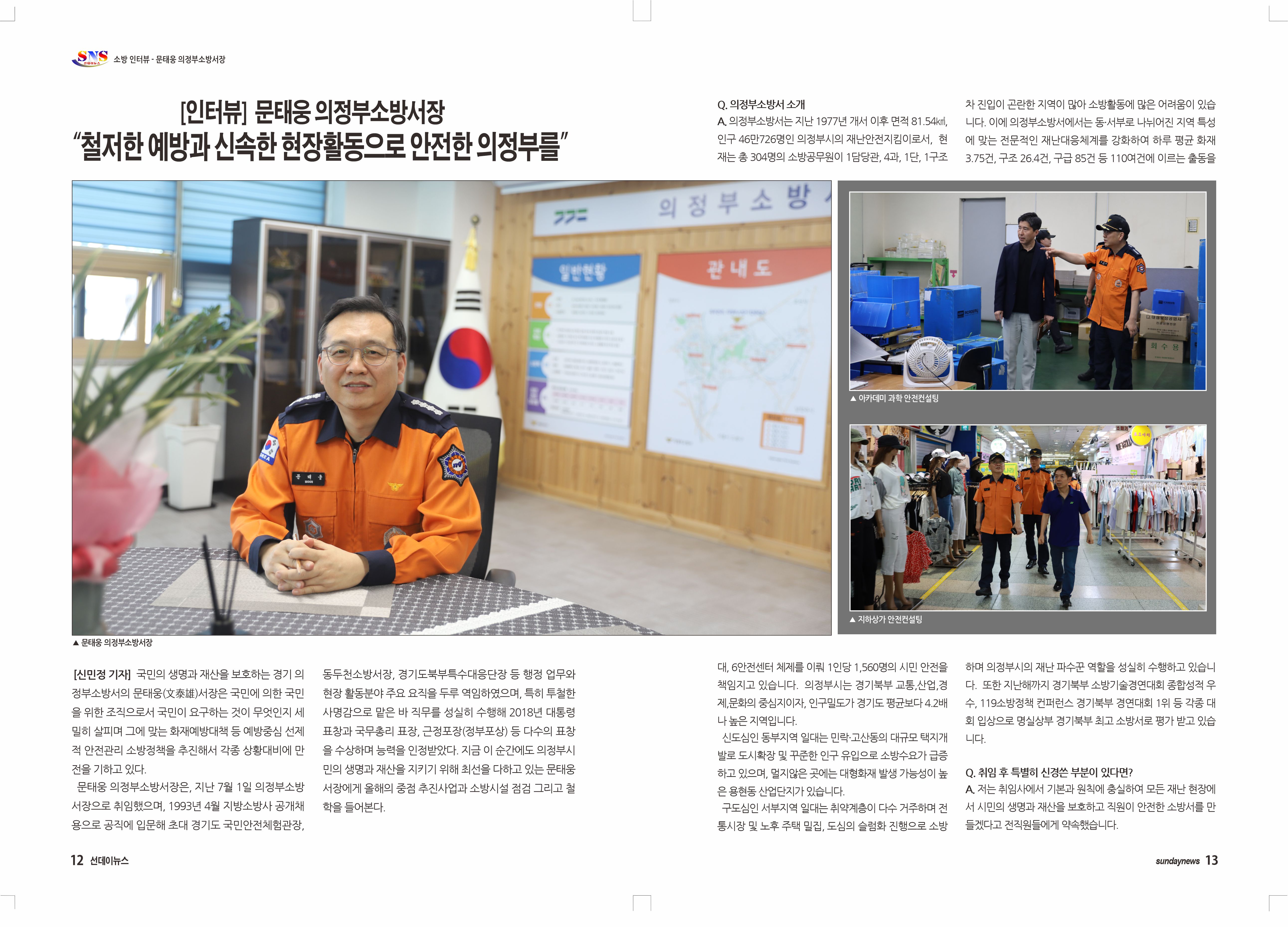 지금 이 순간에도 의정부시민의 생명과 재산을 지키기 위해 최선을 다하고 있는 문태웅 서장에게 올해의 중점 추진사업과 소방시설 점검 그리고 철학을 들어본다.