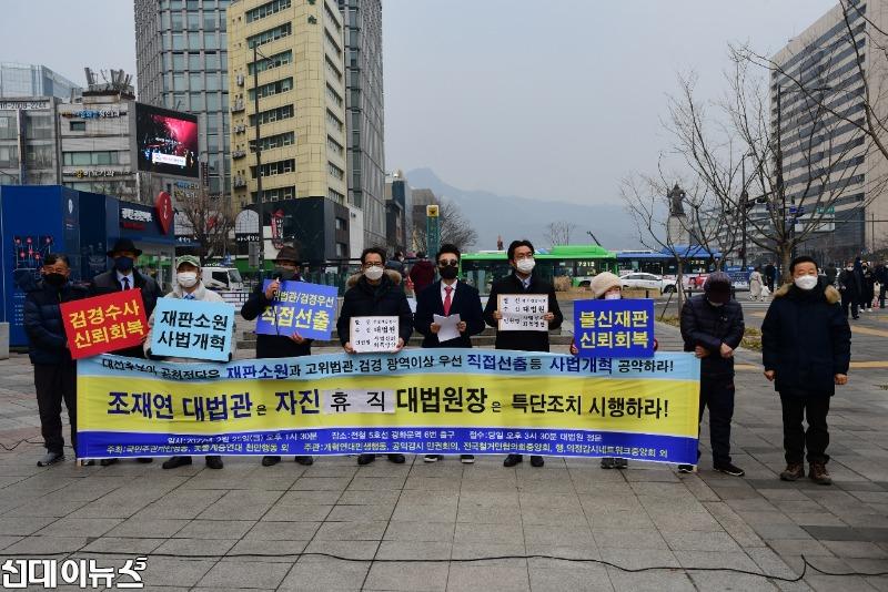 이들은 이날 오후 광화문역 6번 출구 앞에서 열린 기자회견에서 “조재현 대법관은 자진휴직하고 대법원장은 특단의 조치를 시행하라”며 이같이 밝혔다.