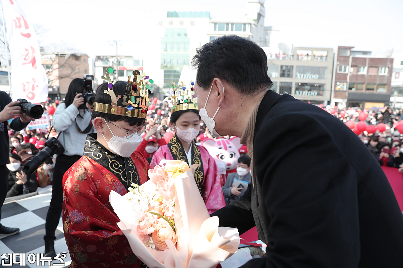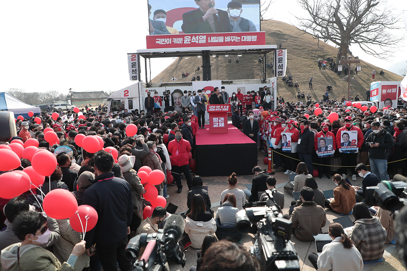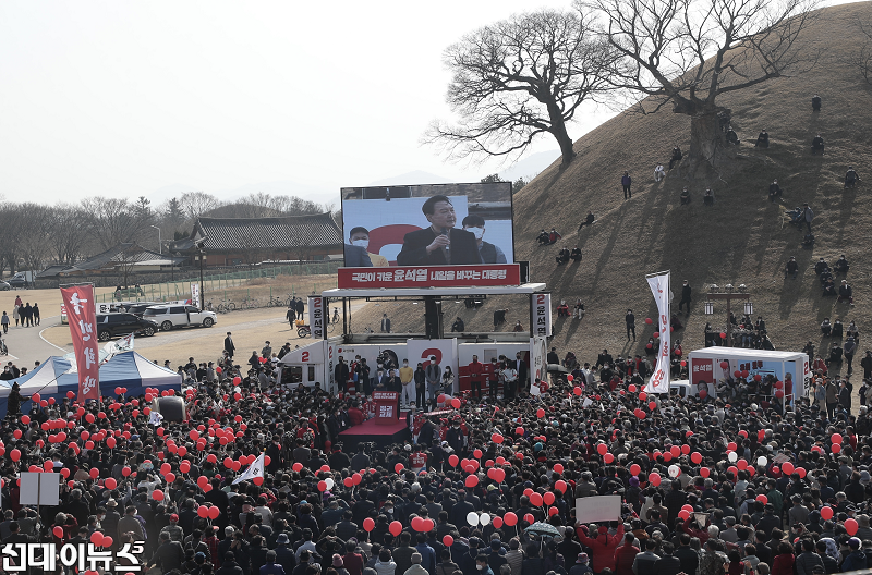 [선데이뉴스신문=이종록 기자] 국민의힘 윤석열 대통령 후보는 2022.3.4.(금) 14:10, 경주 봉황대 광장에서 "천년고도(千年古都) 경주를 세계적 관광도시로!" 경주 유세를 했다.