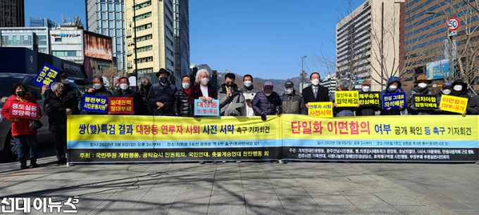 [선데이뉴스신문=정재헌 기자]시민단체 소속 회원들 약 30여 명이 6일 ‘쌍(雙)특검결과 대장동연루자 사퇴 사전서약촉구와 단일화 이면합의(여부) 관련 요구 등을 요구하며 “누가 대통령으로 취임한다고 해도 소송에 휘말려 그 직을 상실할 위험이 매우 높다”고 주장했다.